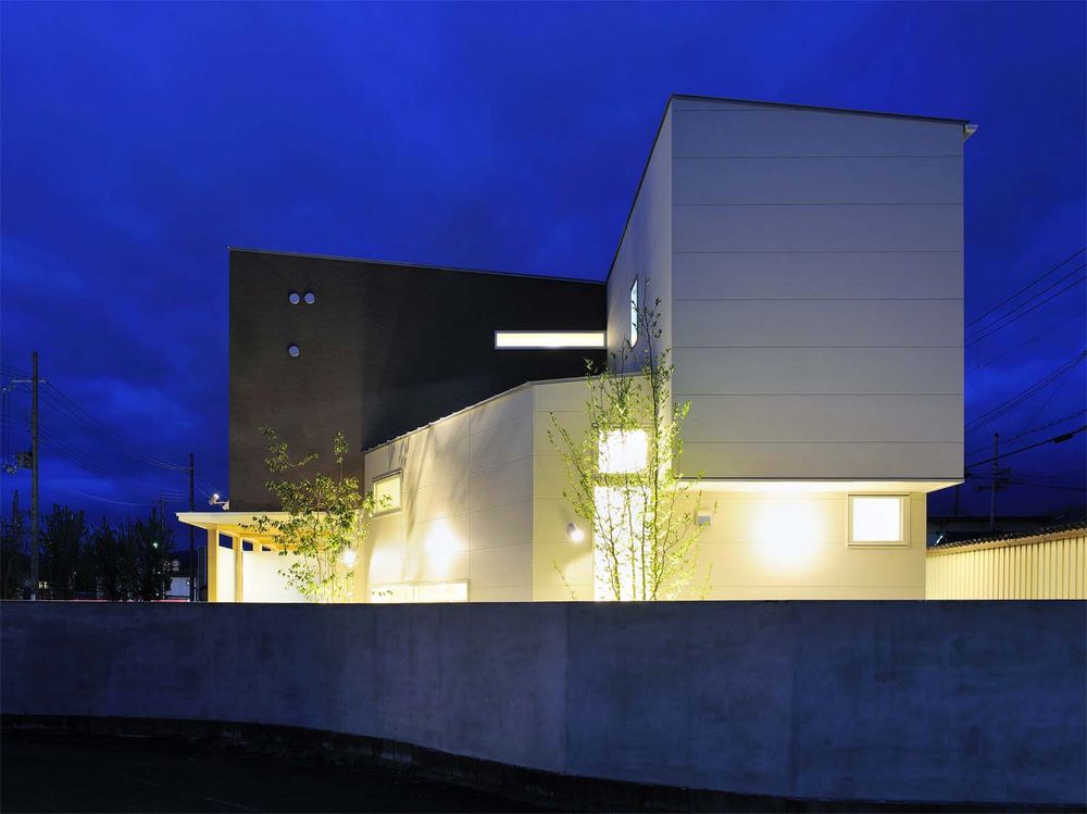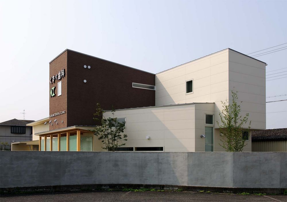 木造2階建ての歯科医院です。外観は、水平方向を強調した1階建ての上に、サイン機能を持たせた箱(2階)が