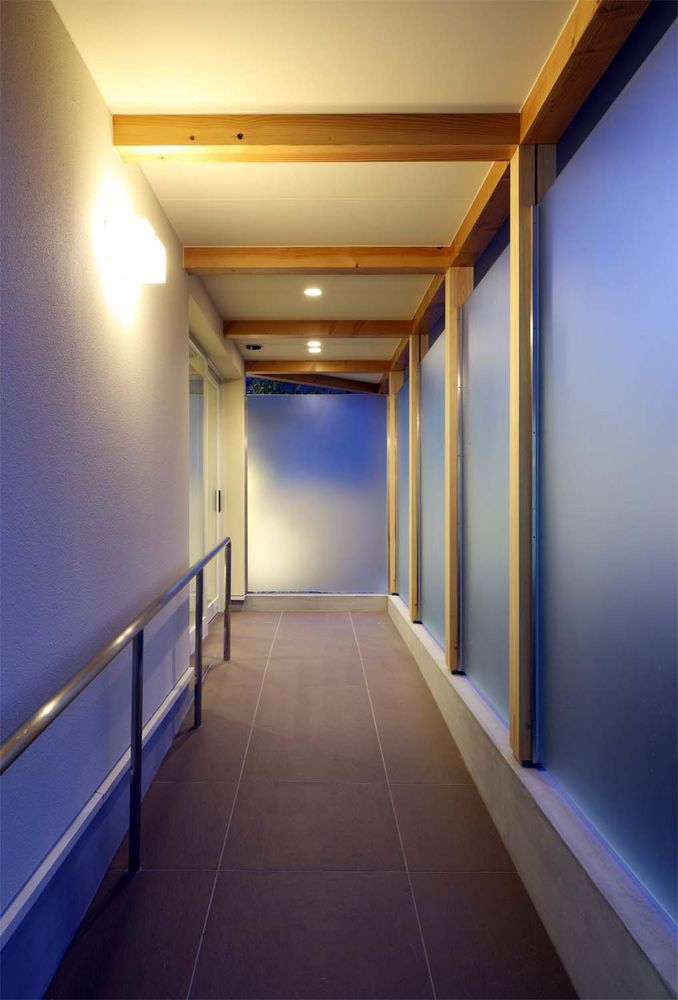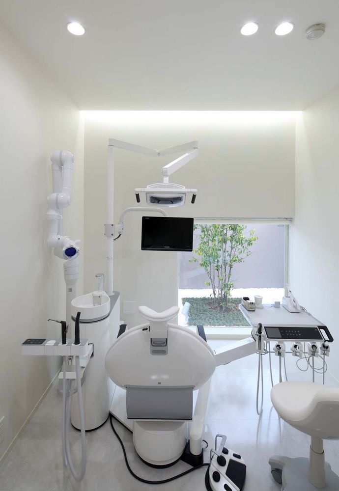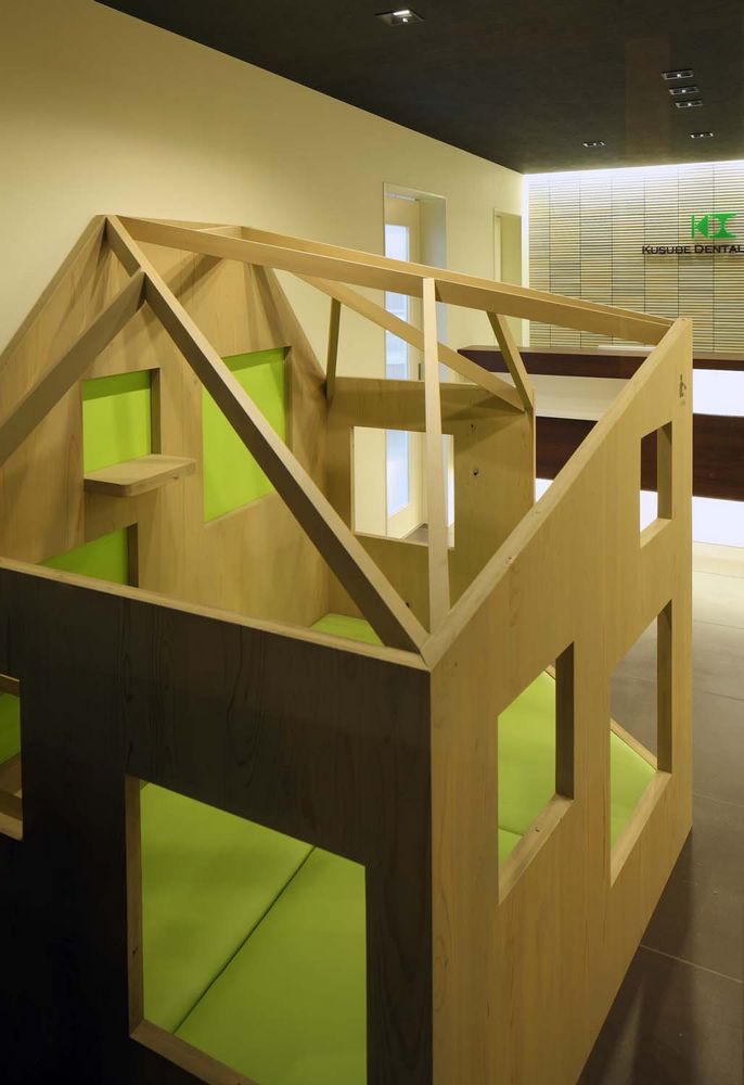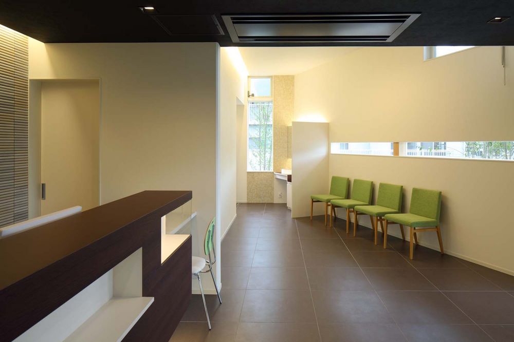 外の景色と緑が覗けるようにしています。ガラスと木のアプローチを抜けた玄関横には、患者にサプライズを与える