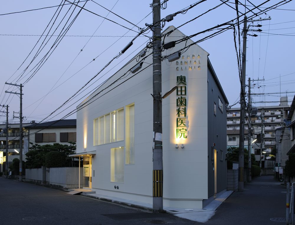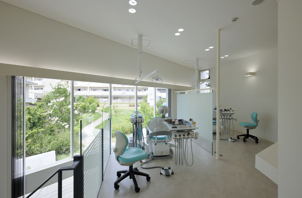 三角形敷地に建つ、吹抜けを持つスキップフロア型木造2階建ての歯科医院です。