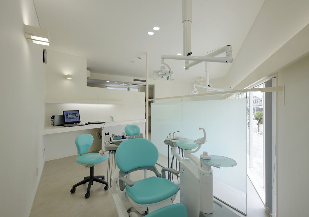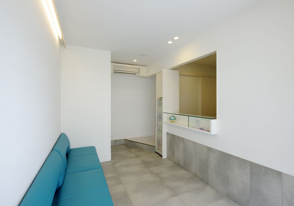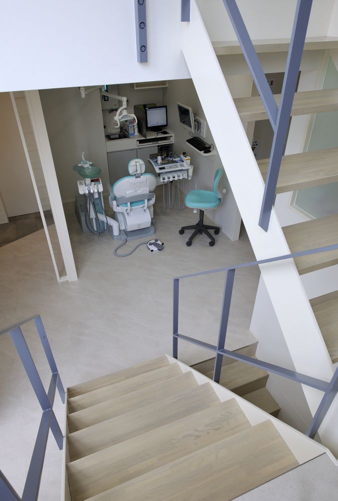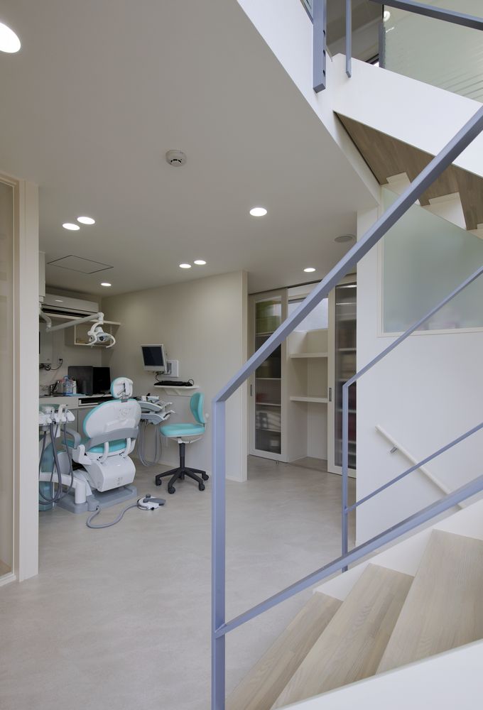 1階に待合い・診察室、半地下にスタッフルーム、中2階にドクタールーム、