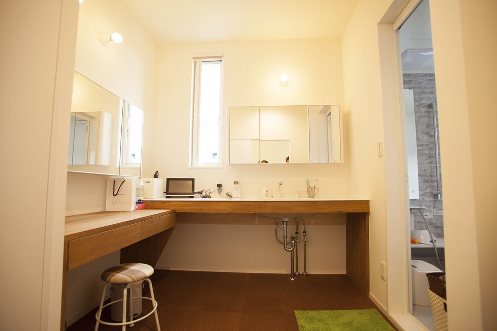 化粧コーナーに衣類の収納、物干しを備えた洗面脱衣スペースは、お気に入りの場所の一つです。