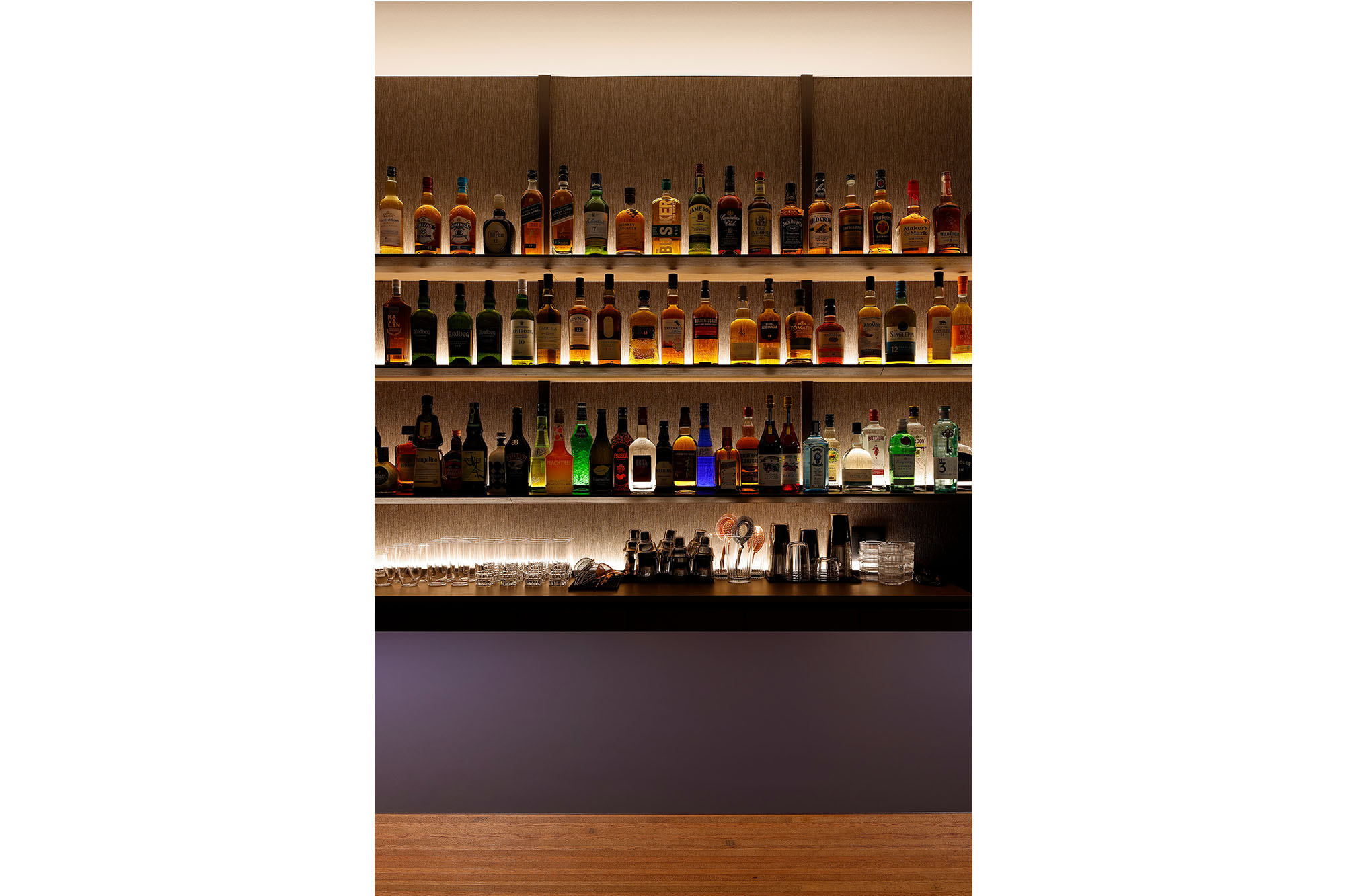 お酒を飾るバックバーは、棚の長さに変化を付け、Berの顔となるようにお酒を背面から